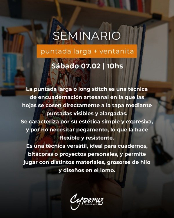 Durante el encuentro vas a aprender la puntada larga simple, una técnica versátil y fácil de adaptar a distintos tipos de cuadernos.